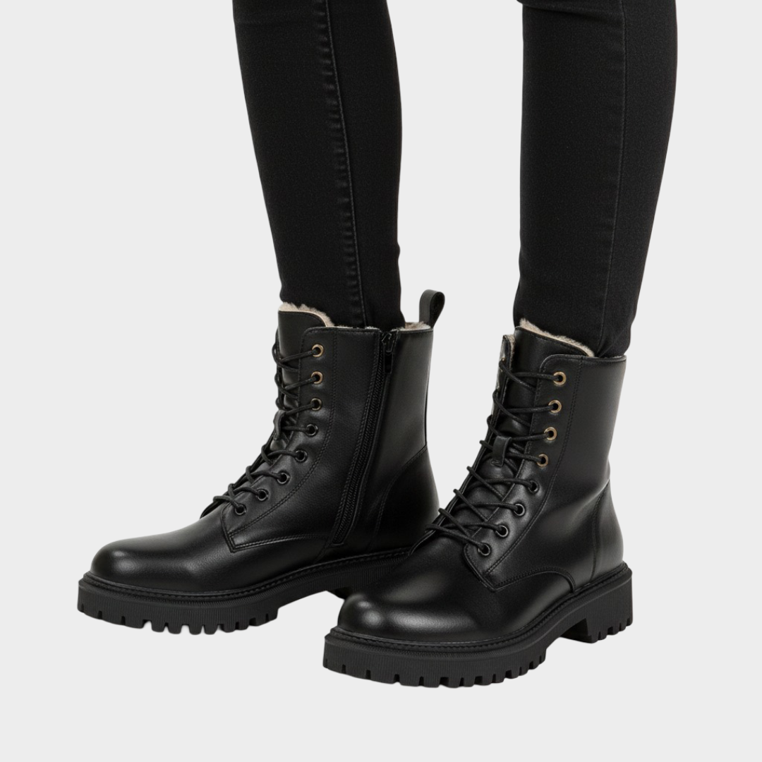 Teplé dámské boty s kožešinovou podšívkou, ideální na zimu. Vnější design z černé koženky je kombinován s vnitřním umělým šinovým materiálem, který poskytuje jemný pocit a pohodlí při nízkých teplotách. Protiskluzová podrážka a praktický zip na boku zajišťují snadné obutí a stabilní chůzi.