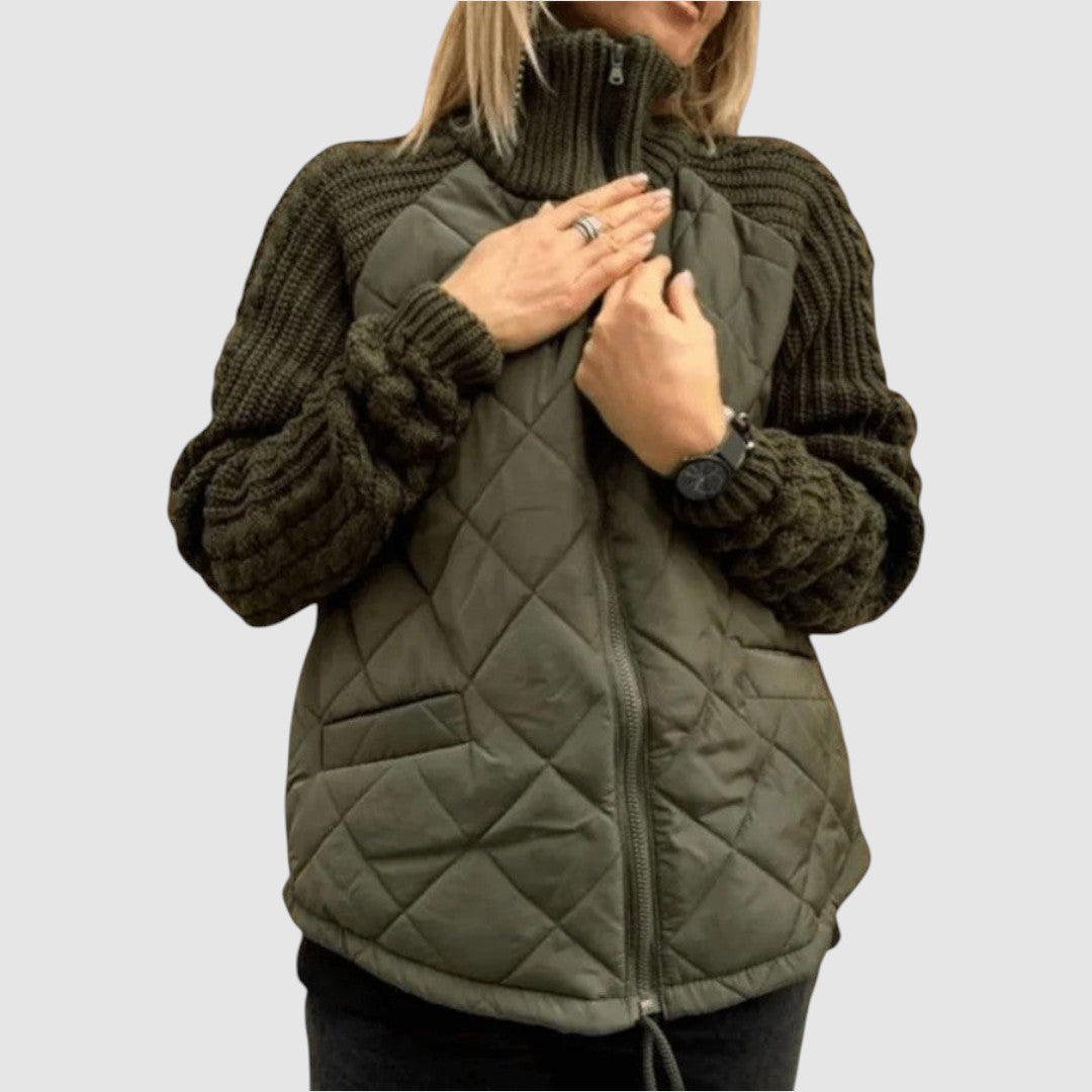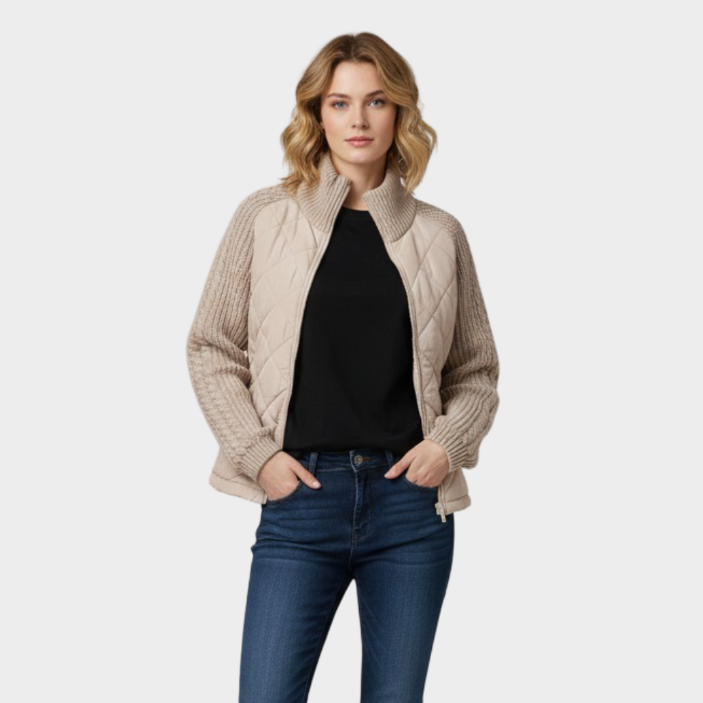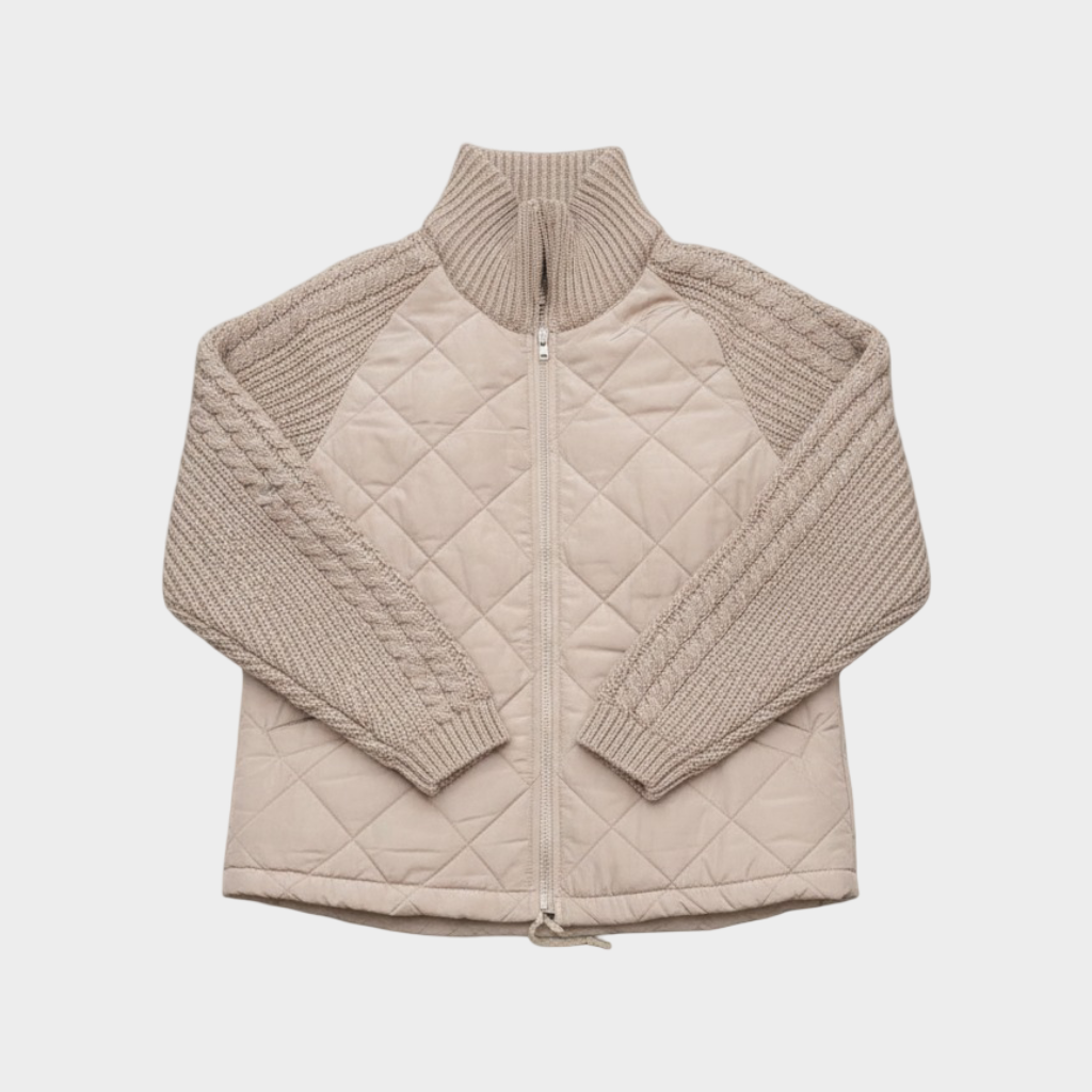 Tato inovativní bunda kombinuje pohodlí svetru s teplem bundy, což z ní dělá perfektní kousek pro přechodné období a podzimní dny. Její hybridní design s prošívaným (vatovaným) tělem a robustními pletenými rukávy nabízí nejen stylový, ale i funkční vzhled. Vysoký žebrovaný límec a zapínání na zip zajišťují maximální ochranu před chladem a větrem. Je to ideální ležérní bunda, která dodá vašemu outfitu moderní texturu a hřejivost.