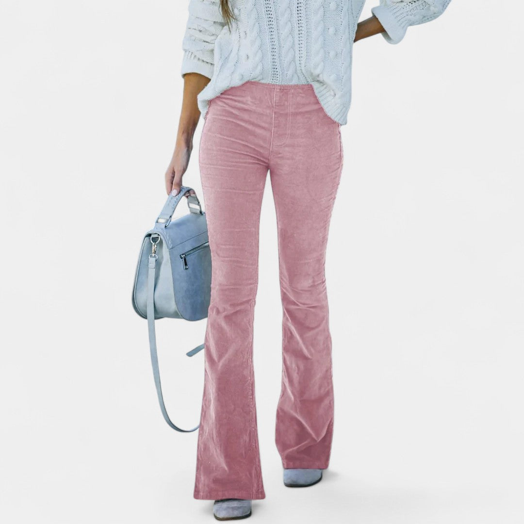 Dodejte svému každodennímu šatníku vintage nádech s těmito zvonovými kalhotami z manšestru s vysokým pasem. Vyrobené z měkké a elastické manšestrové tkaniny, přiléhají k bokům a stehnům, než se rozšiřují k lemu, čímž vytvářejí lichotivou siluetu s retro nádechem. Ideální pro podzimní a zimní outfity ve španělském stylu, tyto kalhoty kombinují pohodlí s odvážným retro stylem.
