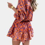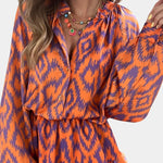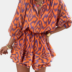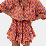 Vibrující energie s bezstarostným nádechem. Mono Yasmine míchá radost šatů s funkčností overalu, díky svému ikat vzoru v oranžových a fialových tónech, mini střihu s vrstvenými volánky a uvolněné siluetě s nabíranými rukávy.