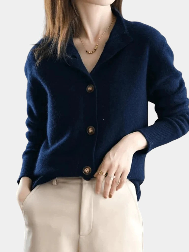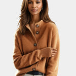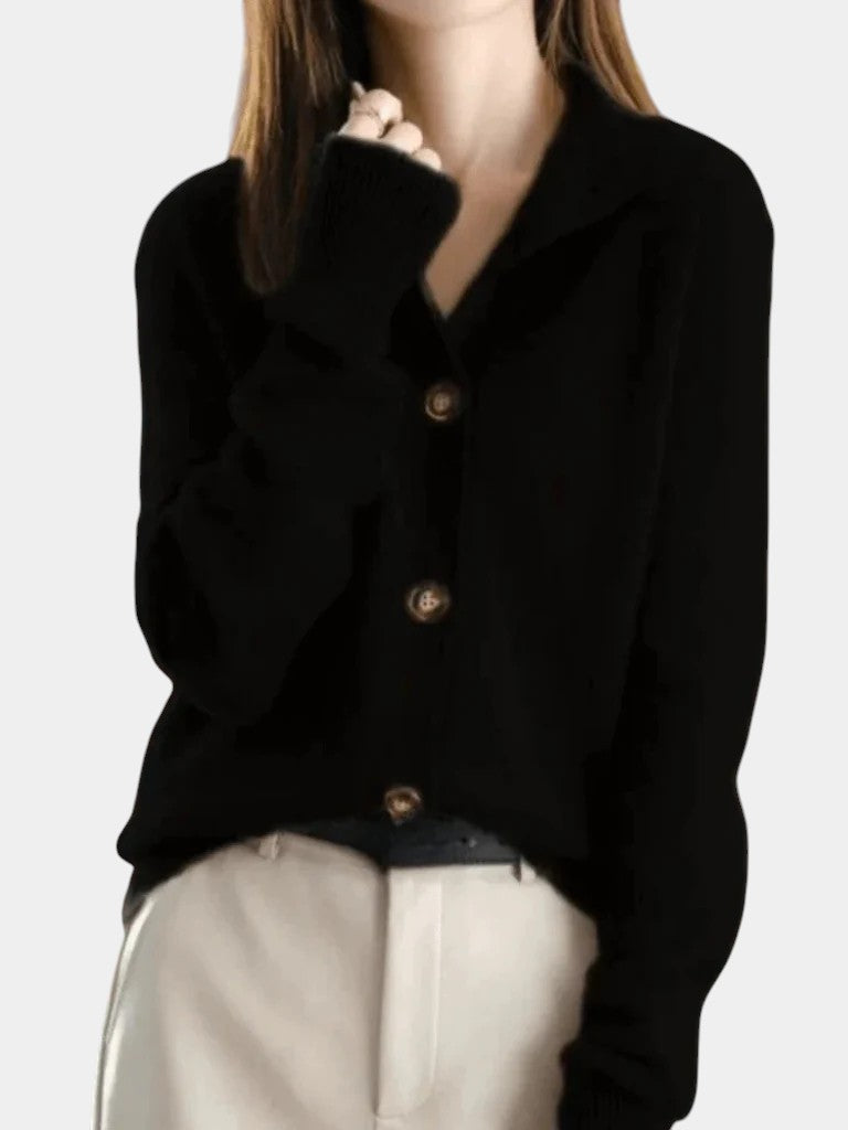 Cardigan Sofia s Knoflíky spojuje útulné pohodlí s elegancí nadčasového kousku. Upletený z měkké a teplé látky, krásně padne s uvolněným střihem, který usnadňuje vrstvení. Klasické přední zapínání na knoflíky a jemný límec dodávají sofistikovaný nádech, čímž se tento kousek stává něčím víc než jen obyčejným cardiganem: je to univerzální doplněk pro každé roční období.
