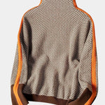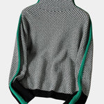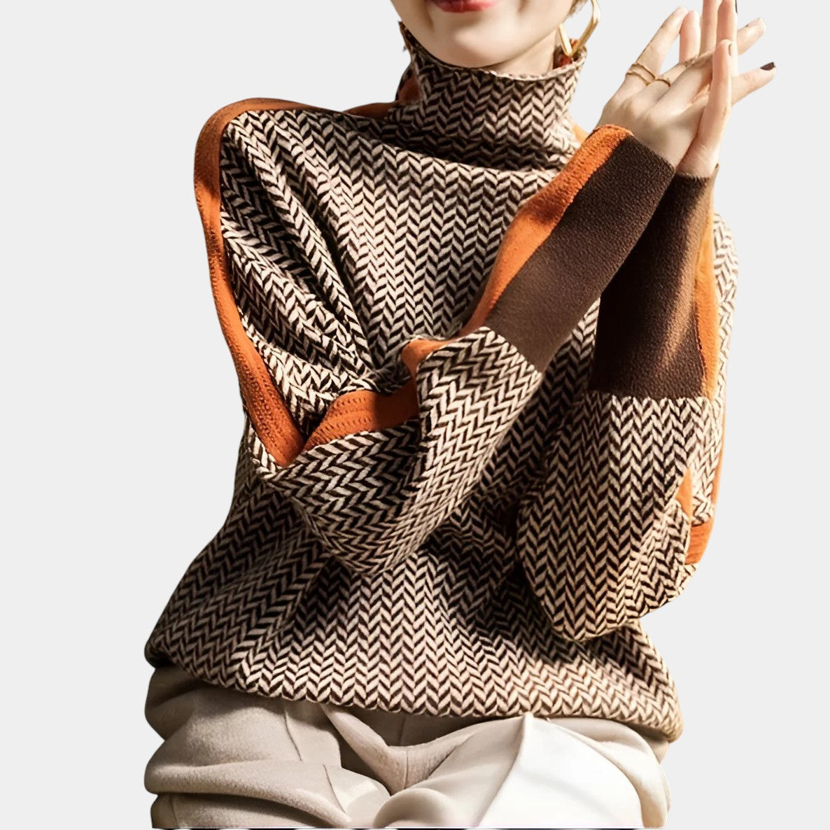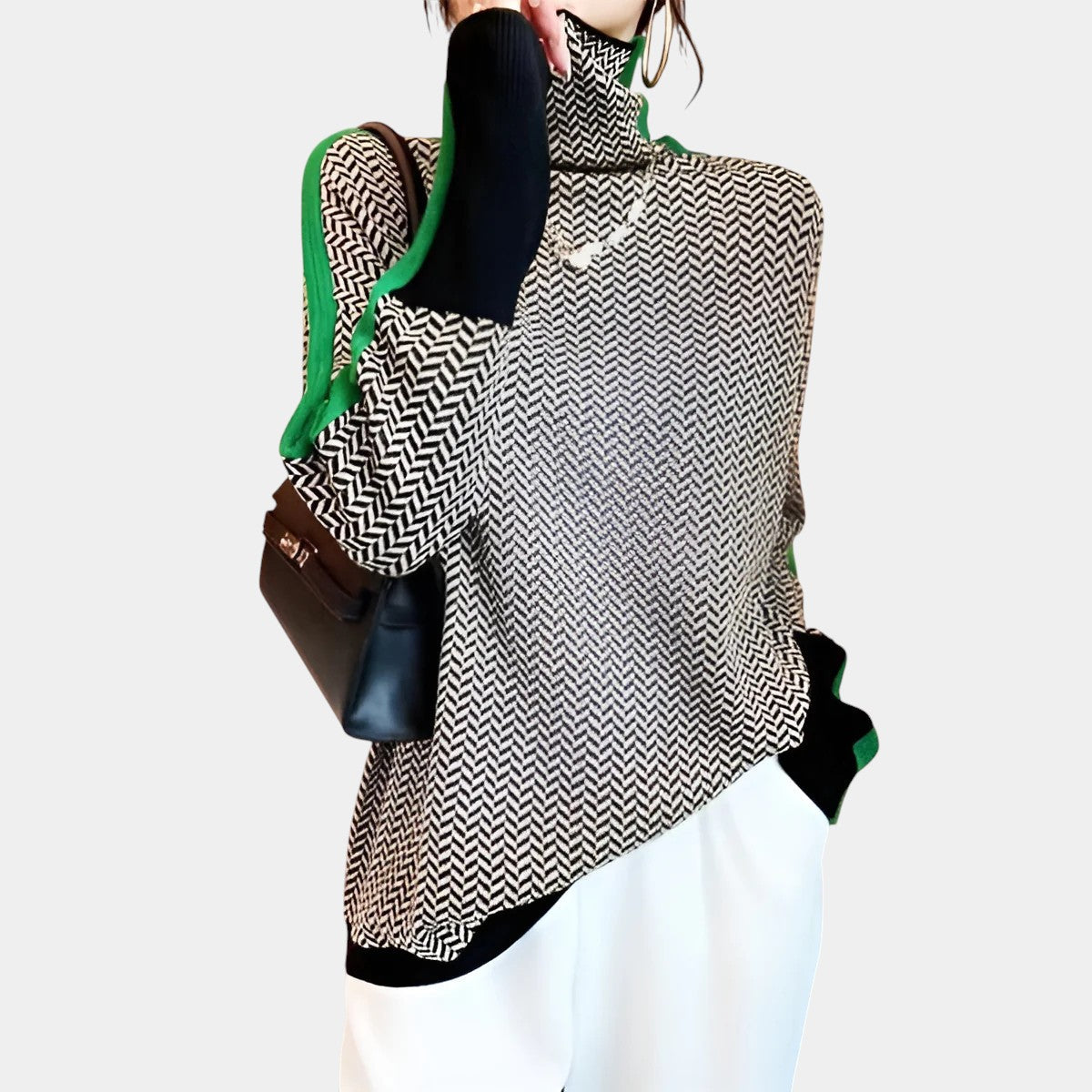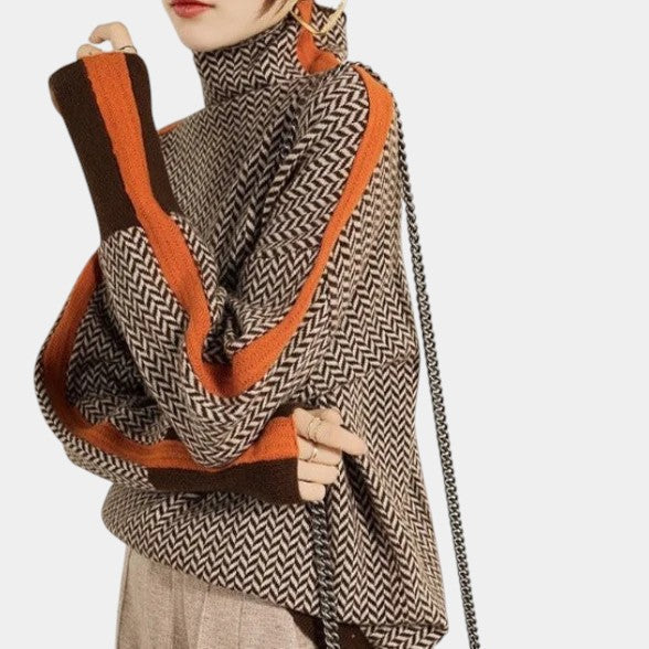 Představ si… podzimní ráno v Madridu, svěží vzduch, horká káva v ruce. Oblékáš si svůj svetr, cítíš útulnou měkkost materiálu a přirozenou eleganci jeho vysokého límce. Kontrastní pruhy nejsou jen detail: tvarují tvou siluetu a přitahují pohled s diskrétností a stylem.