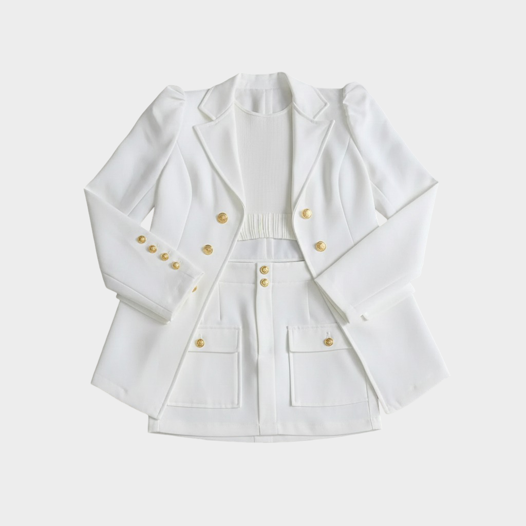 Elegantní sada z pevného blazeru s dlouhým rukávem a odpovídající mini sukně. Ideální pro elegantní příležitosti nebo pro stylové každodenní outfity.