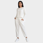 Vynikněte svým stylem s touto elegantní a pohodlnou dvoudílnou sadou v krémové barvě. Jednoduchý střih a moderní fit je ideální pro každodenní nošení, ale také pro uvolněnější výlety.