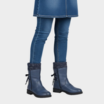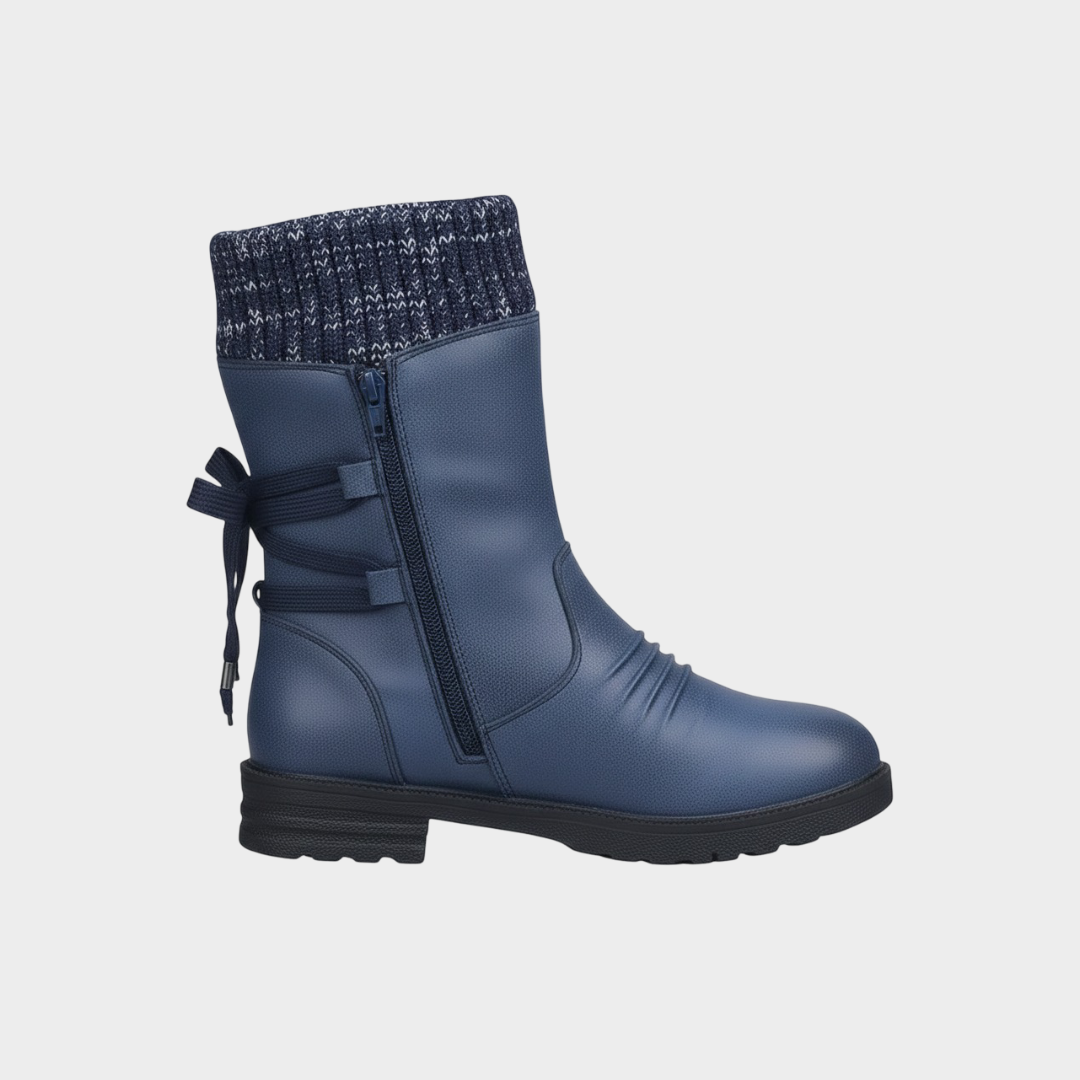 Moderní dámské boty v modré barvě s jedinečným městským charakterem. Mají pletený detail v horní části pro teplo a styl, stejně jako dekorativní prvky s mašlí a nýty na boku. Protiskluzová podrážka a zip na boku zajišťující pohodlí a praktičnost, což je ideální pro zimní ležérní vzhled se stylem.