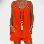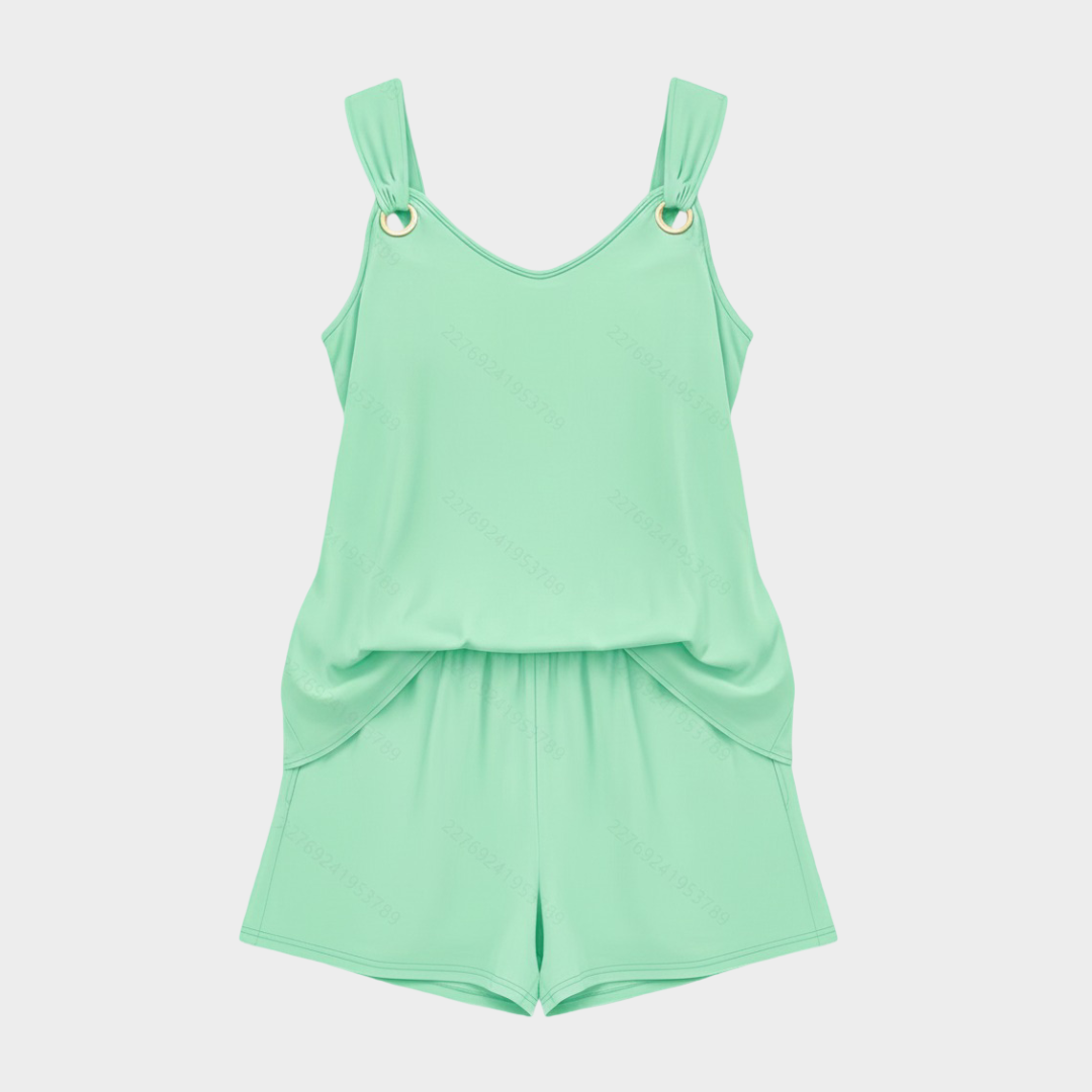 Naprostý šik outfit, který kombinuje letní svět a eleganci. Bezrukává blůza s V výstřihem decentně zvýrazňuje dekolt, zatímco šortky nabízejí pohodlné nošení a ženskou siluetu. Moderní set pro každou chvíli dne.