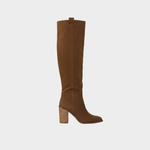Dámské vysoké boty z hnědého semiše s elegantním designem, který kombinuje klasický western styl s moderními liniemi. Vysoký svršek obepíná nohu a poskytuje ženskost a eleganci, zatímco stabilní podpatek dodává výšku a pohodlí. Nadčasový kousek, který lze nosit s šaty, sukněmi nebo skinny džíny, tvoří elegantní vzhled se stylem.