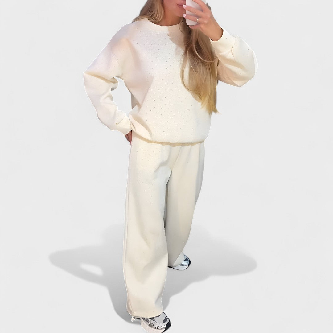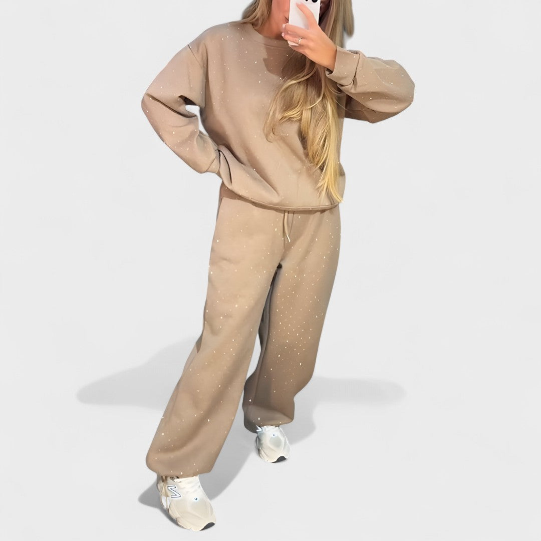 Tato souprava je určena pro každého, kdo rád spojuje maximální pohodlí s nenápadnou elegancí. Uvolněný střih v kombinaci s jemnými třpytivými detaily proměňuje pohodlný outfit v stylový kousek, ideální pro volné dny, relax nebo chvíle, kdy se chceš cítit skvěle i doma.